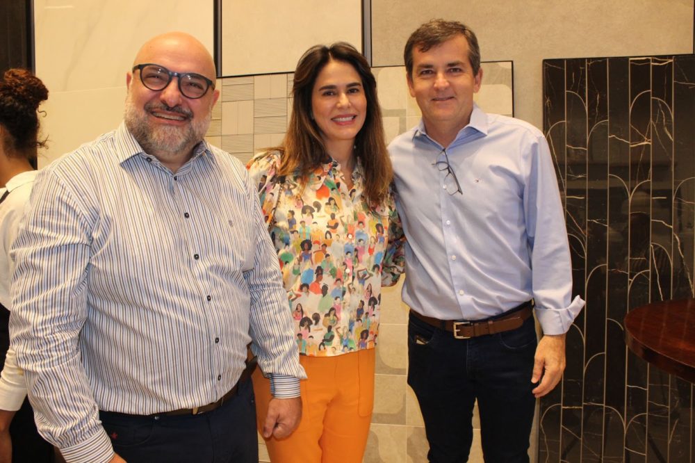 O empresário Ricardo Bagnato recepcionando o casal Luciana e o esposo Rogério Montolar na inauguração da loja Portobello Shop