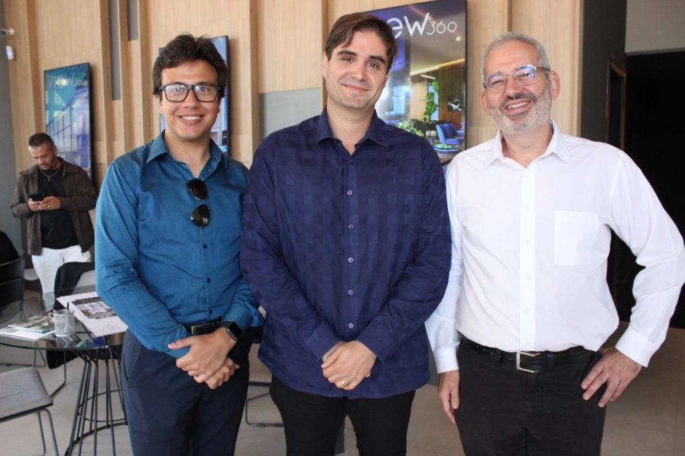 Felipe Orlando e Maurício Viegas recepcionando o empresário Diego Alonso no estande de vendas do Residencial View 360