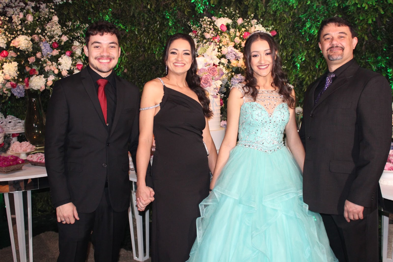 Marcos Amorim com a esposa Cinéia e o filho Gabriel na linda festa de debutante da filha Isabela