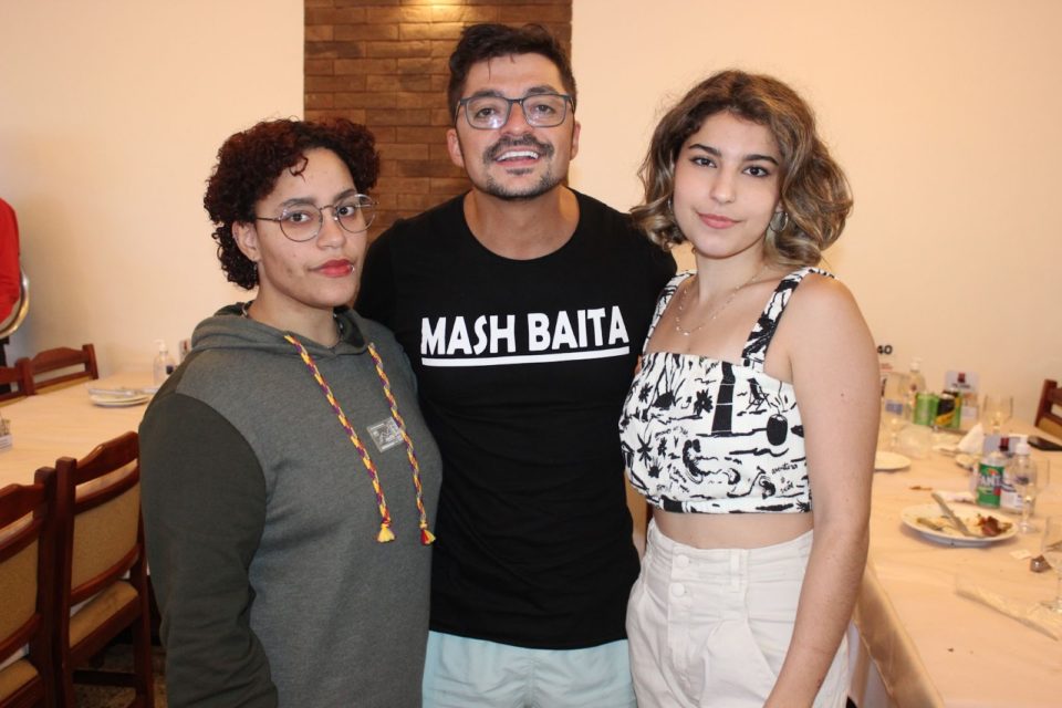 Beatriz Bernardoni e a amiga Julia Golmia posando ao lado do ator humorista Márcio Donato