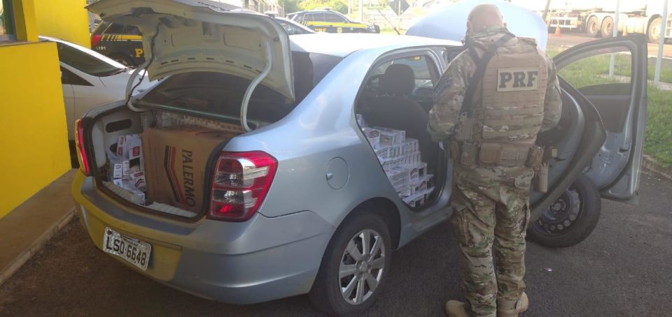 Dentro do carro estavam os maços de cigarro contrabandeados de origem paraguaia. A carga foi avaliada em R$ 62,5 mil.
