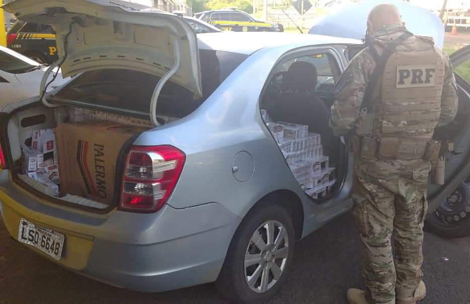 Dentro do carro estavam os maços de cigarro contrabandeados de origem paraguaia. A carga foi avaliada em R$ 62,5 mil.