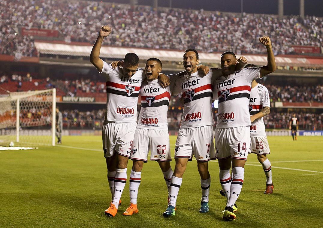 Jogadores do São Paulo comemoram gol contra o Vitória