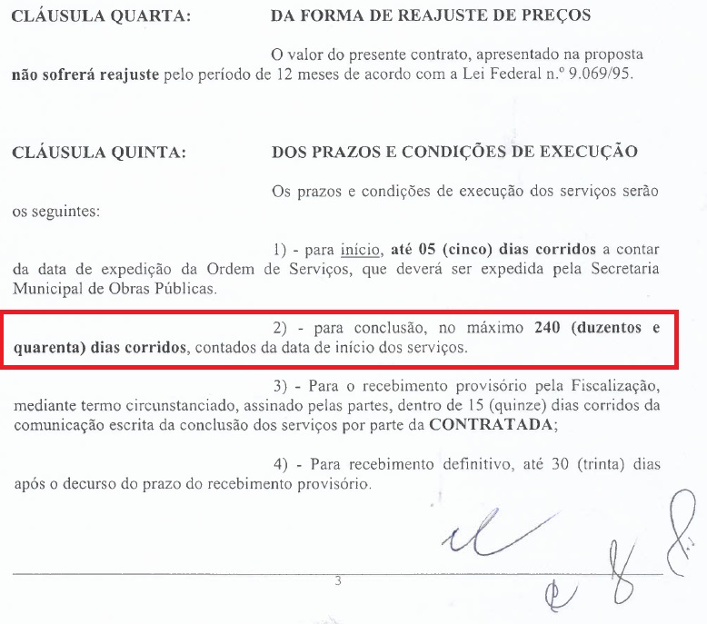 Como o serviço teve início no dia 30 de março, deveria ter sido finalizado no dia 25 de novembro, porém até o momento as obras não estão prontas.