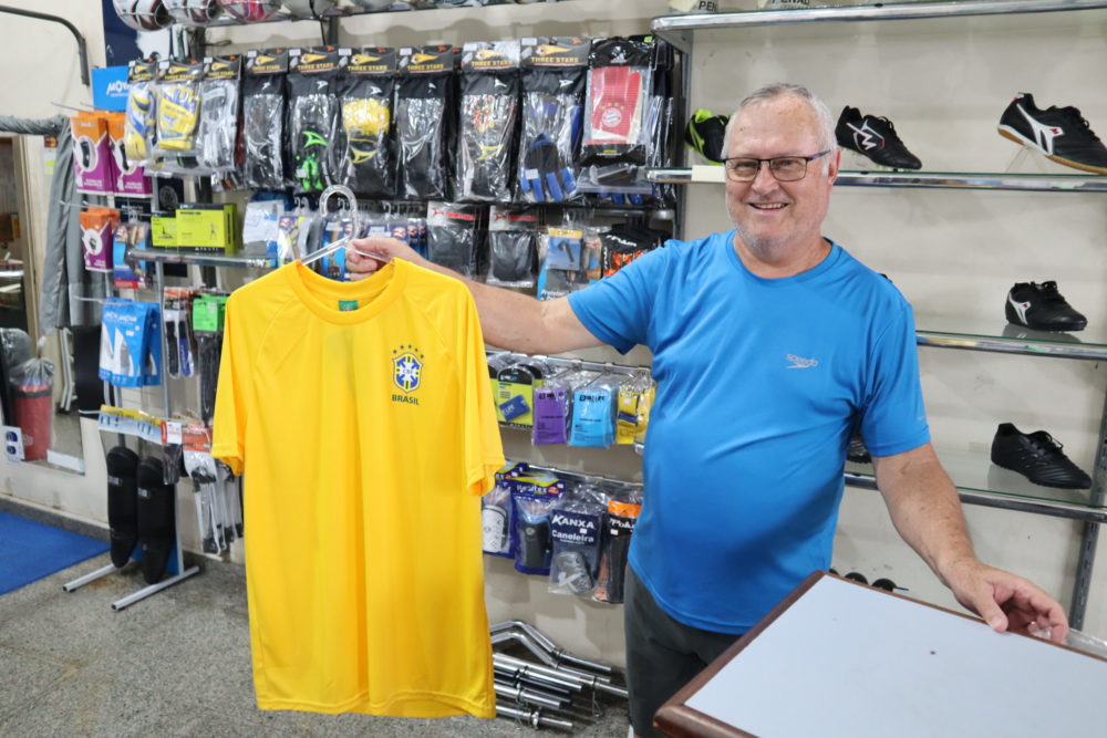 Essa é a primeira vez em 22 anos que o comerciante Pedro Garcia não tem camiseta oficial da Seleção Brasileira para vender (Foto: Alcyr Netto/Marília Notícia)