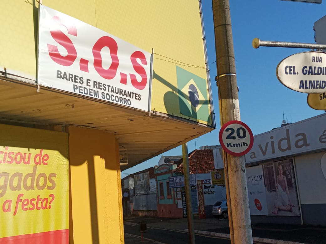 Faixa em comércio no Centro de Marília pede socorro (Foto: Carlos Rodrigues/Marília Notícia)