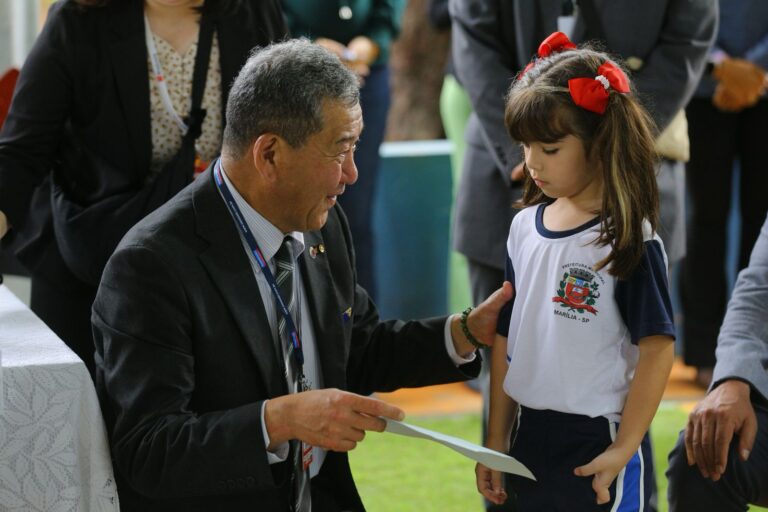 Em seguida, a comitiva visitou a Escola Municipal de Educação Infantil (EMEI) 1,2, Feijão com Arroz, no bairro Ana Carla, onde conheceu a estrutura da rede municipal de ensino. A programação contou ainda com apresentações culturais de danças típicas do Brasil e do Japão, além do plantio de duas árvores — um ipê amarelo e uma cerejeira — simbolizando a união entre os países.