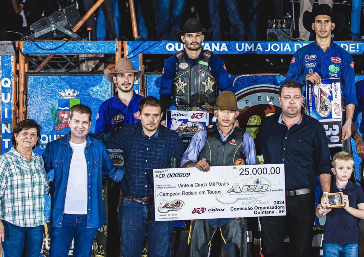 O jovem competidor Felipe da Cruz Souza, de Pompeia, foi o grande campeão da 36ª Festa do Peão de Quintana, que terminou neste domingo (1º). Evento começou na sexta-feira (29) e reuniu um público de aproximadamente 30 mil pessoas durante três dias.