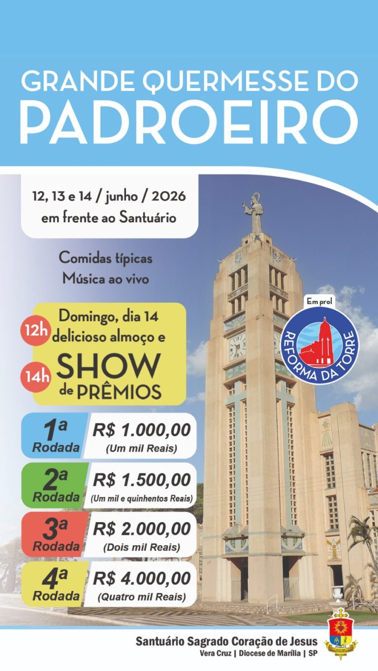 A comunidade do Santuário Sagrado Coração de Jesus, em Vera Cruz, iniciou os preparativos para a tradicional Grande Quermesse do Padroeiro, marcada para os dias 12, 13 e 14 de junho de 2026, em frente ao templo. Segundo a organização, o evento tem como objetivo arrecadar recursos para a reforma da torre do santuário.