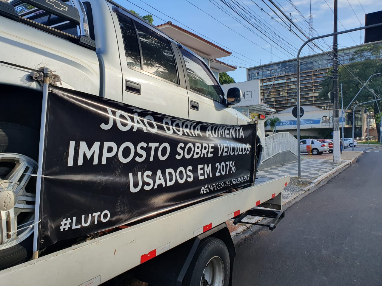 Em uma caminhonete, carregada por um guincho, estava fixada uma faixa em que constava a denúncia “João Doria aumenta impostos sobre veículos usados em 207%” e as hashtags #luto e #éimpossíveltrabalhar.
