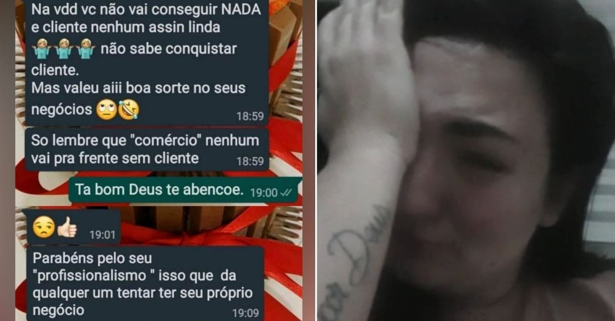 Na troca de mensagens por aplicativo de mensagens, a mulher chama Ângela de “louca”, insinua que ela não deveria cobrar por estar começando na atividade comercial e diz que ela “não conseguirá nada da vida dessa maneira”.