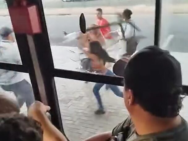 Depois do bate-boca, um deles desceu e se armou com um pedaço de madeira. Pelo lado de fora, quebrou um dos vidros laterais do ônibus. Uma mulher também se armou.