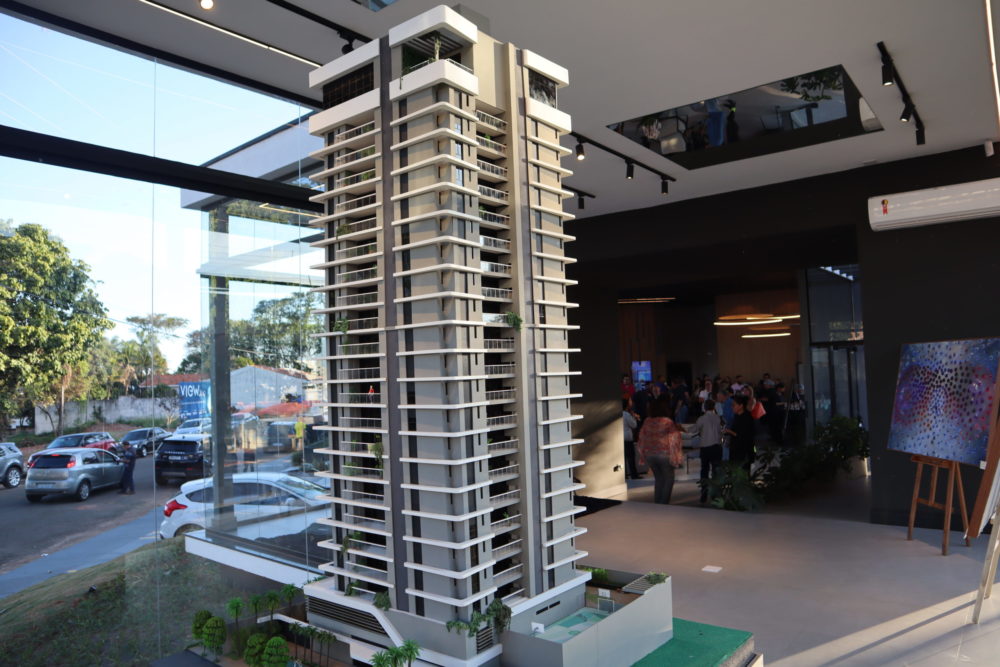 Imponente maquete do View 360 exposta para interessados em garantir um apartamento (Foto: Alcyr Netto/Marília Notícia)