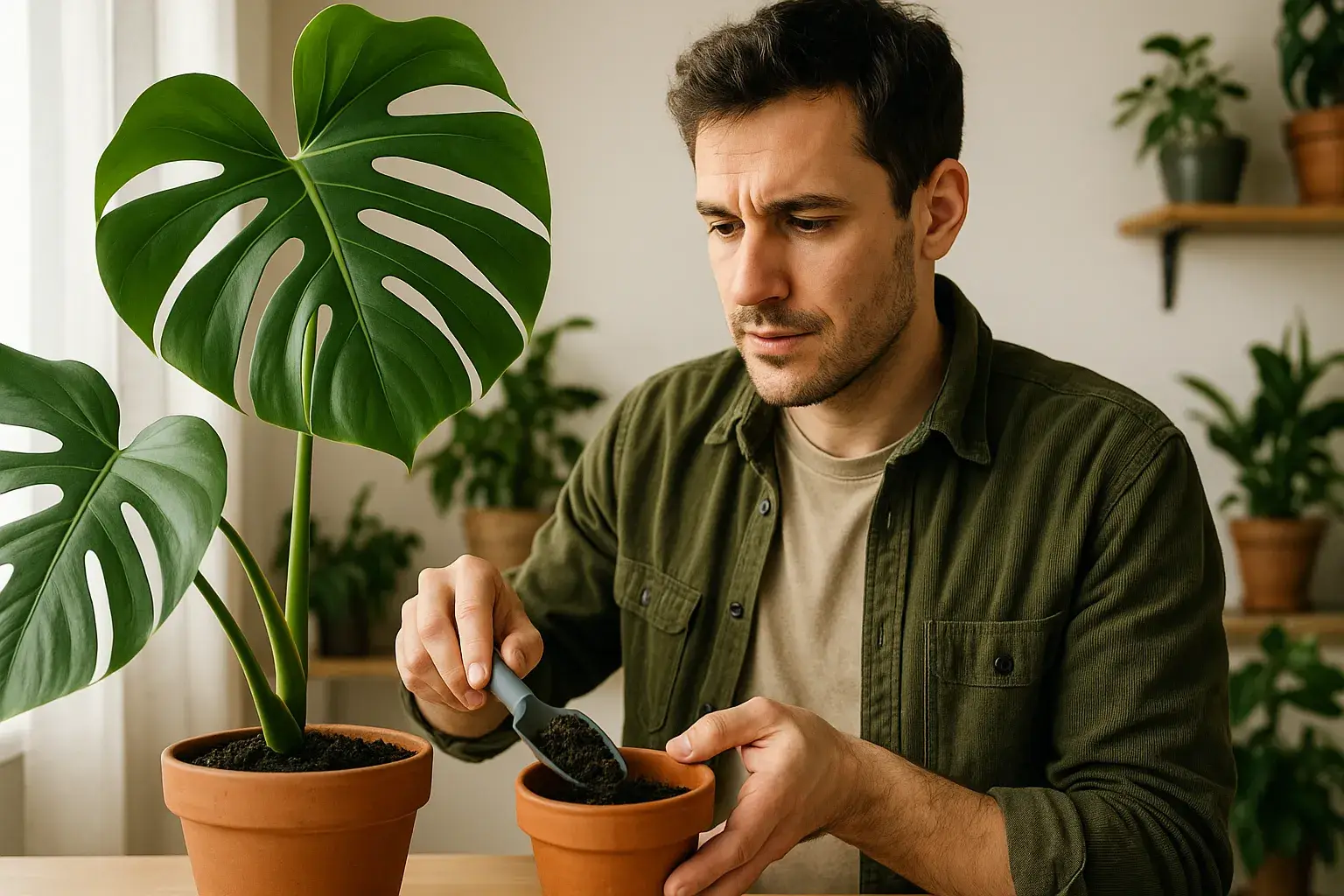 Outro vilão invisível do crescimento da costela-de-adão é o substrato. Com o tempo, o solo do vaso pode ficar compactado e pobre em matéria orgânica. Isso atrapalha a drenagem e dificulta a respiração das raízes, tornando qualquer adubo ineficaz.