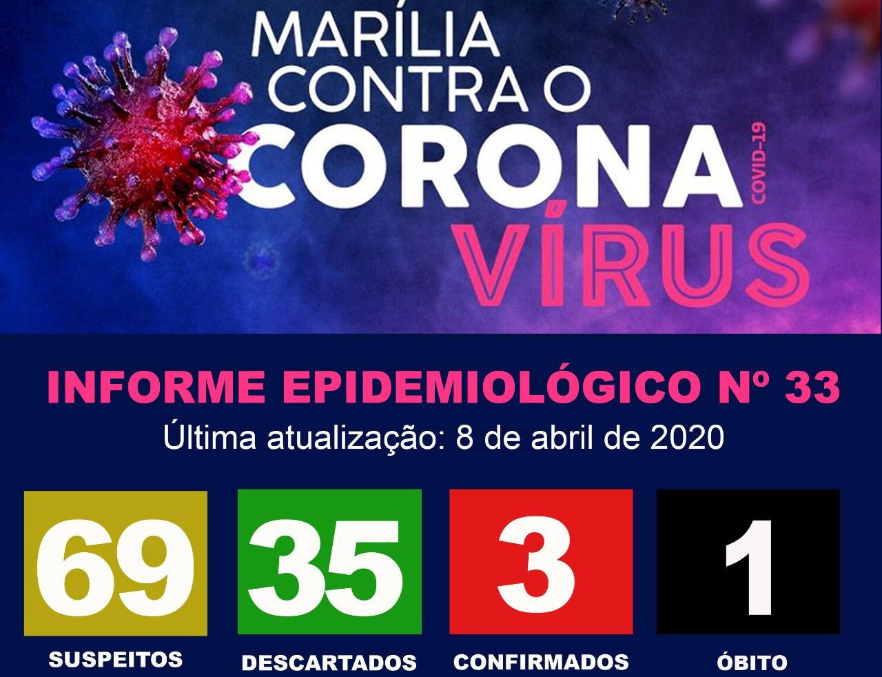 A cidade tem três óbitos sob investigação e um já confirmado, como novo coronavírus. Os dados podem ser acompanhados pelo endereço eletrônico marilia.sp.gov.br/coronavirus, inclusive com o mapa georreferenciado dos casos suspeitos.