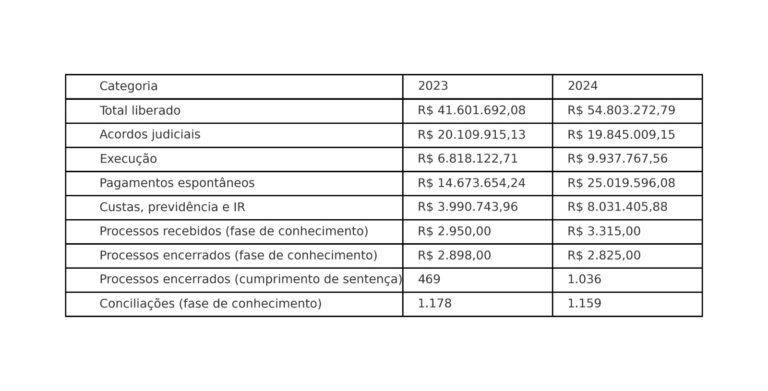 A maior parte desse valor veio de acordos judiciais, que somaram R$ 19,8 milhões — praticamente o mesmo patamar de 2023 (R$ 20,1 milhões). Já os pagamentos obtidos na fase de execução — quando a decisão é colocada em prática — cresceram de R$ 6,8 milhões para R$ 9,9 milhões. Os pagamentos espontâneos, feitos sem cobrança judicial, também tiveram forte alta: de R$ 14,6 milhões para R$ 25 milhões.