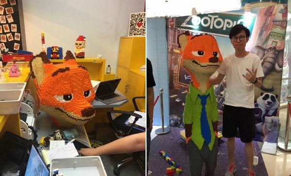 O escultor chinês Zhao passou três dias construindo uma réplica do personagem Nick Wilde, do filme “Zootopia” (2016), feita totalmente com peças de Lego, e acabou tendo uma surpresa ao expor a escultura em um shopping de Ningbo (China).
