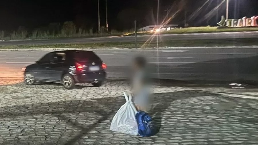 Menino foi deixado sozinho, com uma sacola e uma mochila, em um trevo na entrada do município. O caso foi registrado na terça-feira (14). Uma testemunha que estava no local chegou a fotografar o momento do abandono.