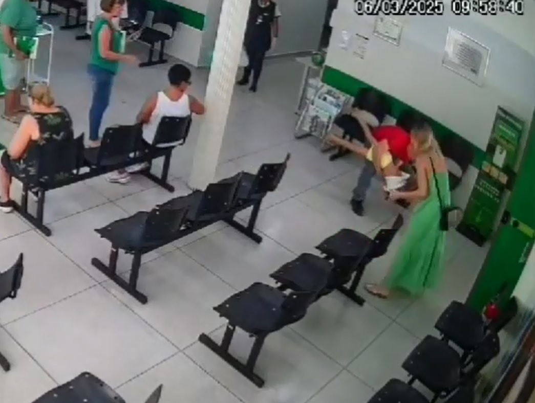 Imagens da câmera de segurança do local registraram o momento em que a menina começou a se engasgar e a mãe a levou até o cabo Thiago Bustamante. Com rapidez e precisão, o bombeiro iniciou as manobras de desobstrução das vias aéreas.
