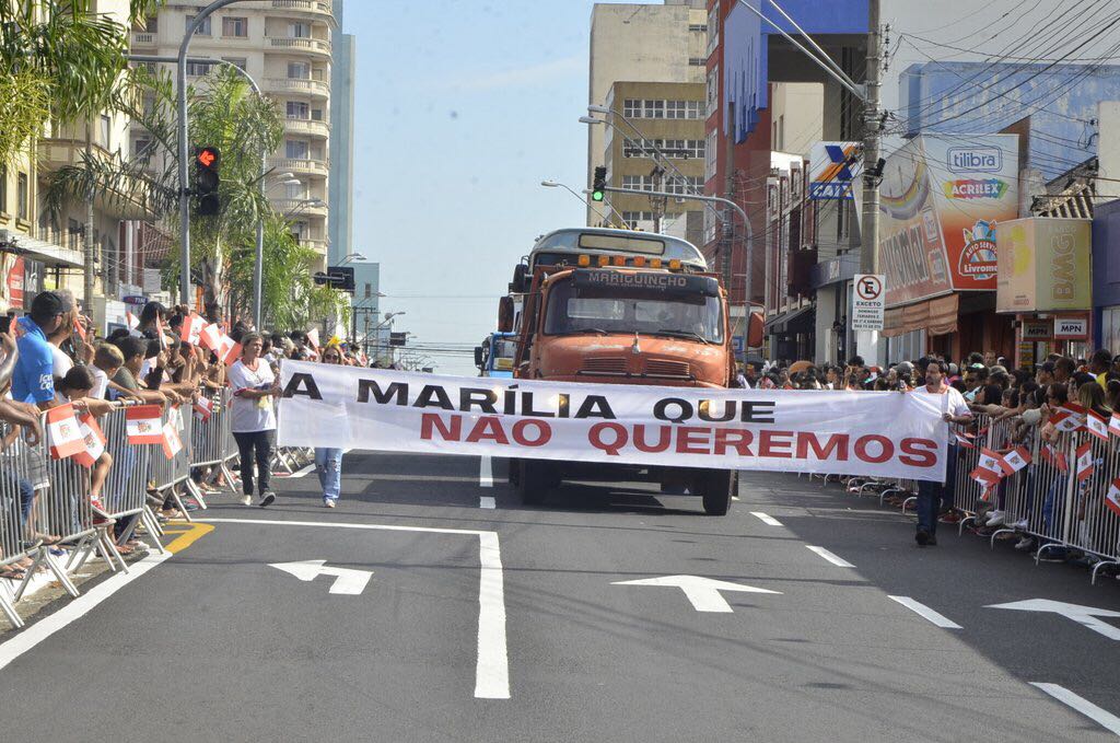 O tradicional desfile cívico-militar na Avenida Sampaio Vidal, que ocorreu pela manhã, ganhou tons políticos e de crítica do prefeito Daniel Alonso (PSDB) à última gestão municipal.