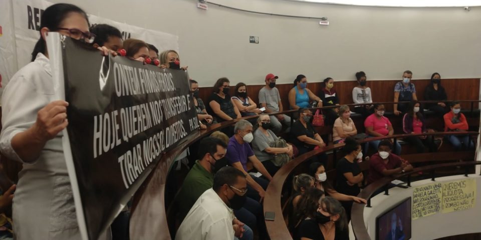 Servidores municipais ocuparam as galerias e a sessão teve momentos de tensão, chegando a ser interrompida. Houve inclusive intervenção policial (confira o vídeo no fim do texto), devido aos gritos dos manifestantes e interrupções no andamento dos trabalhos.
