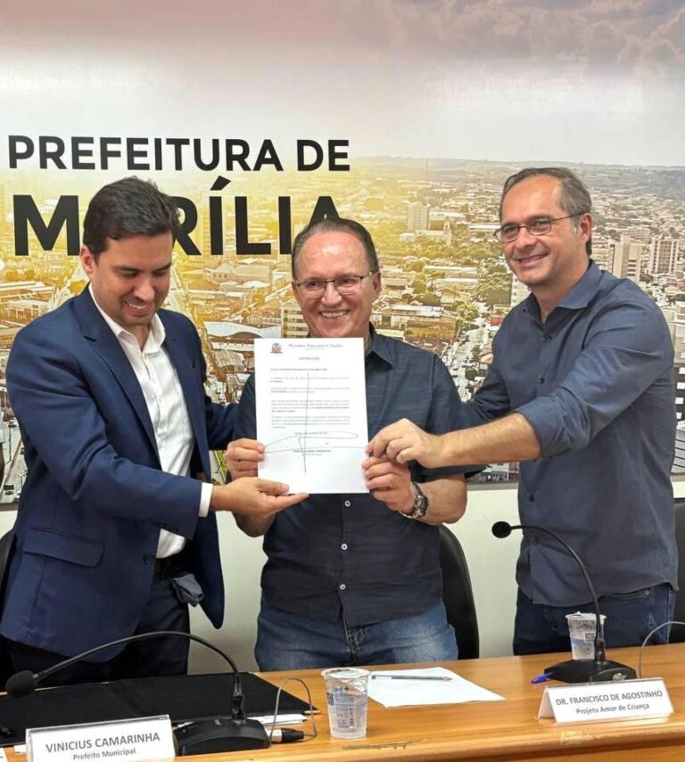 O presidente Danilo da Saúde, o prefeito Vinicius Camarinha e o Dr. Francisco Agostinho celebram a primeira etapa da liberação das Emendas Impositivas para entidades de Marília (Foto: Wilson Ruiz)