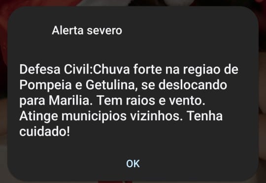 Pouco tempo após o envio do alerta, a chuva começou a cair em Marília, confirmando a previsão dos órgãos de monitoramento. O comunicado foi encaminhado automaticamente para os aparelhos celulares de moradores com a geolocalização ativa na cidade, por meio do sistema estadual de alertas, chamando a atenção da população para os riscos associados às condições climáticas adversas.