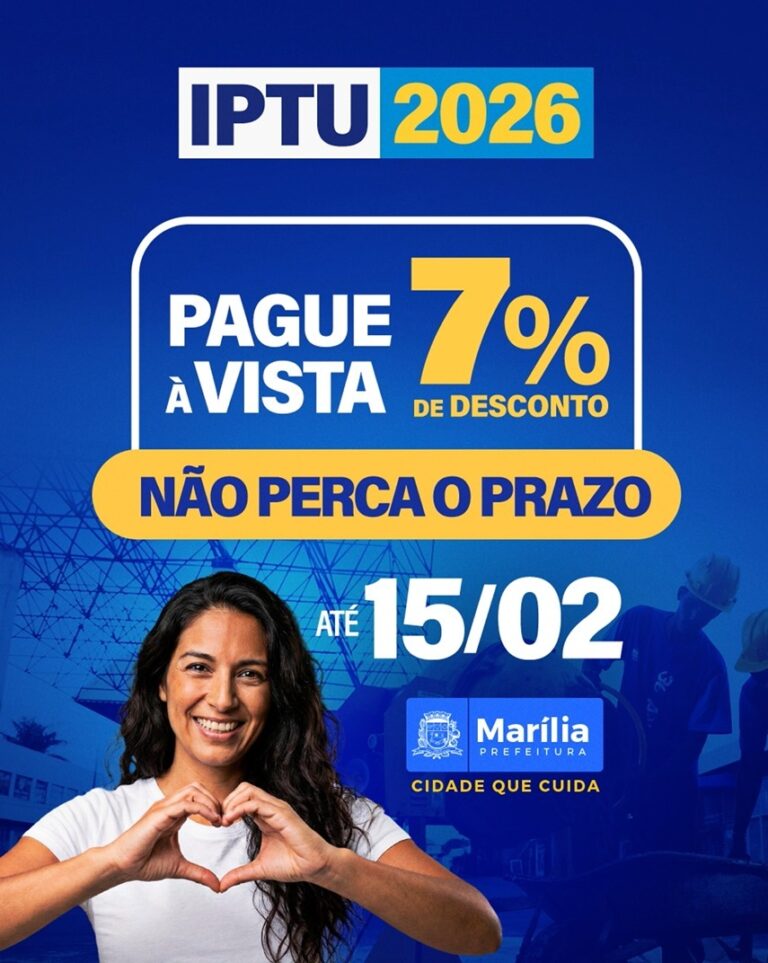A Prefeitura de Marília informou que o pagamento do Imposto Predial e Territorial Urbano (IPTU) de 2026 em cota única, com desconto de 7%, vence no dia 15 de fevereiro. A medida vale para todos os contribuintes e não exige cadastro prévio, segundo a Secretaria Municipal de Finanças e Planejamento Econômico.