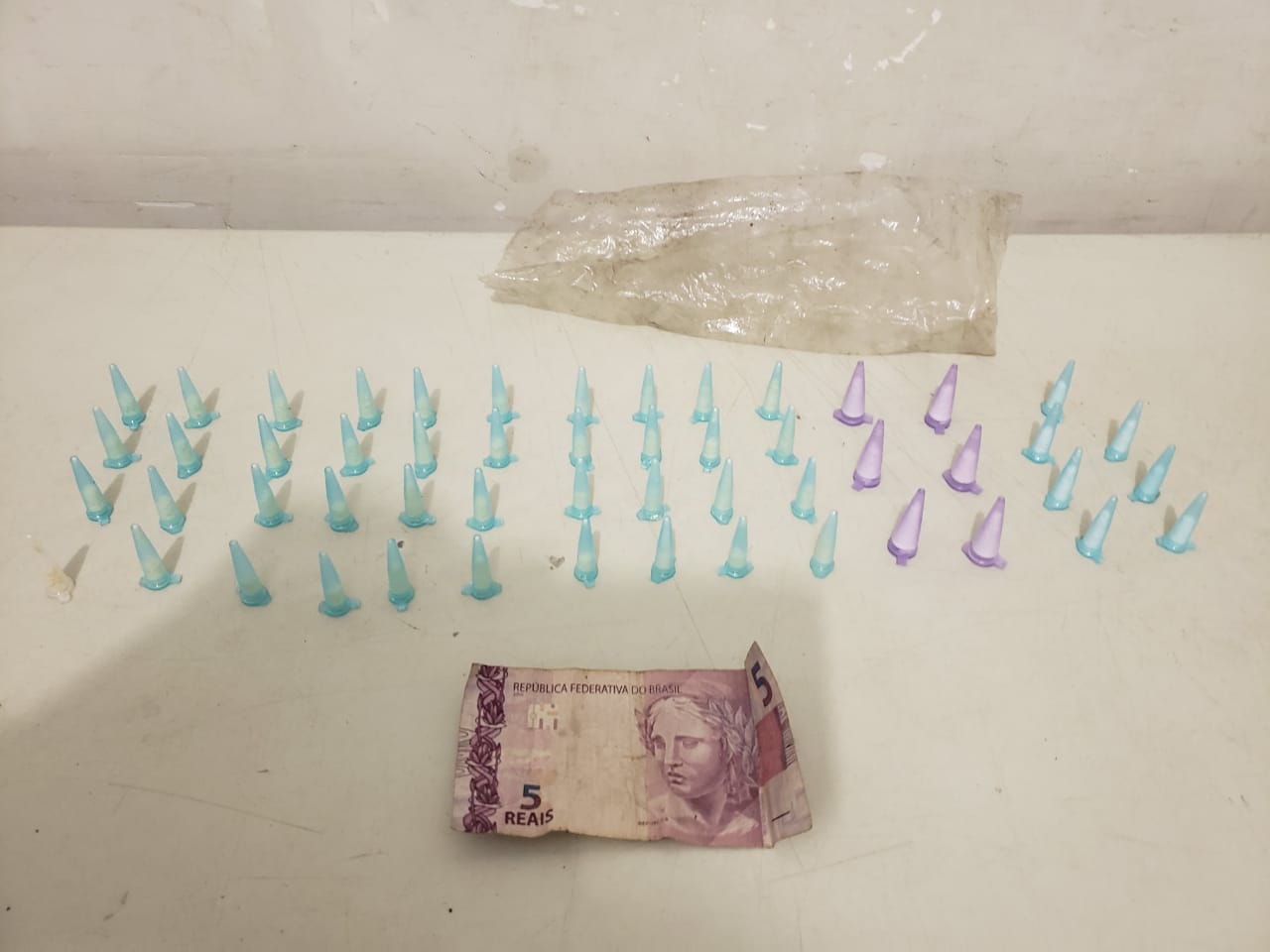O homem foi abordado e com ele havia 40 pinos com crack e 13 pinos com cocaína, além de R$ 5. Indagado, confessou que estava ali para vender drogas.