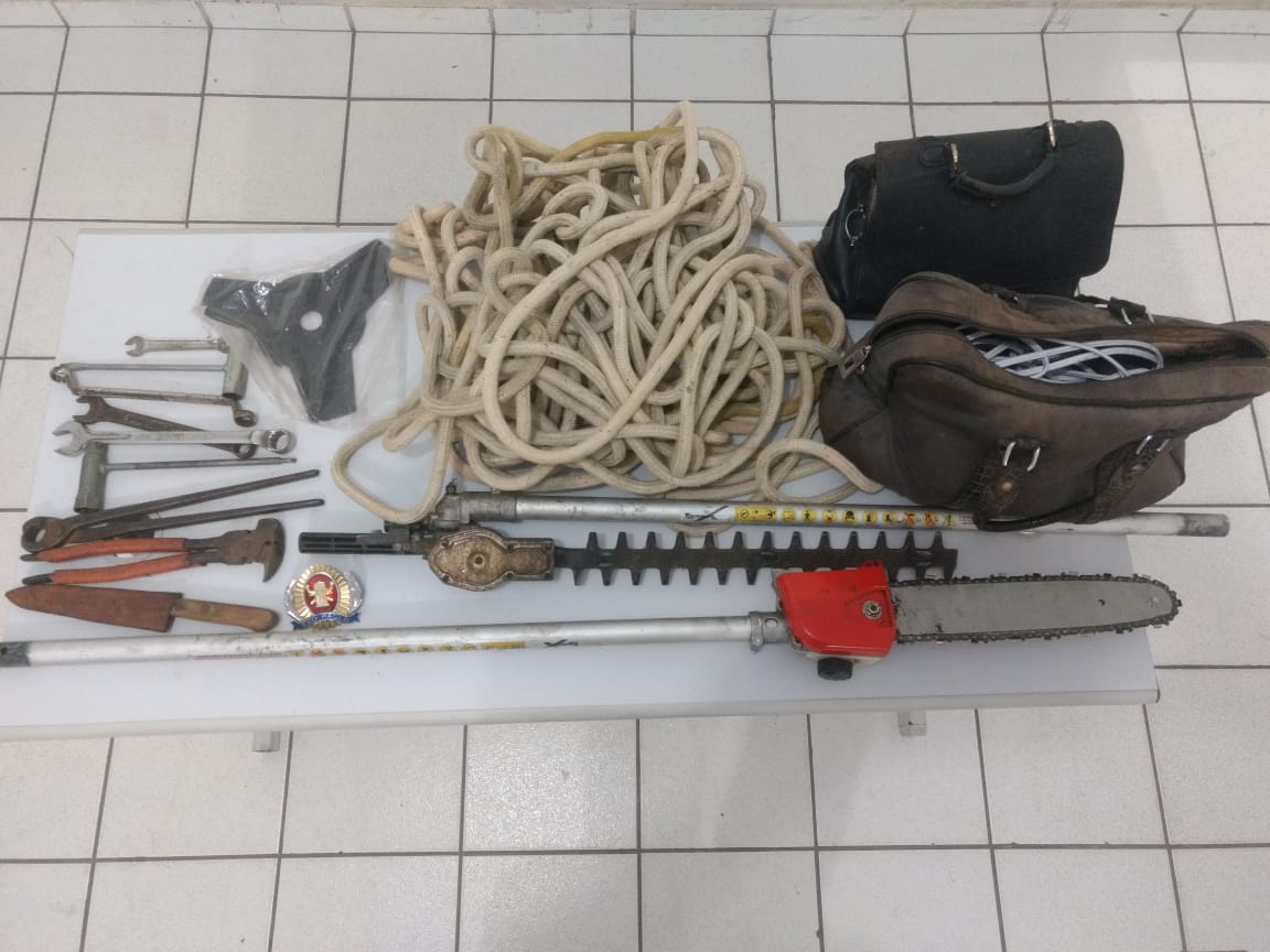 Genivaldo foi abordado e dentro do saco havia duas bolsas com diversas ferramentas e metais pequenos, uma corda de 15 metros, além de peças utilizadas para poda de árvores.