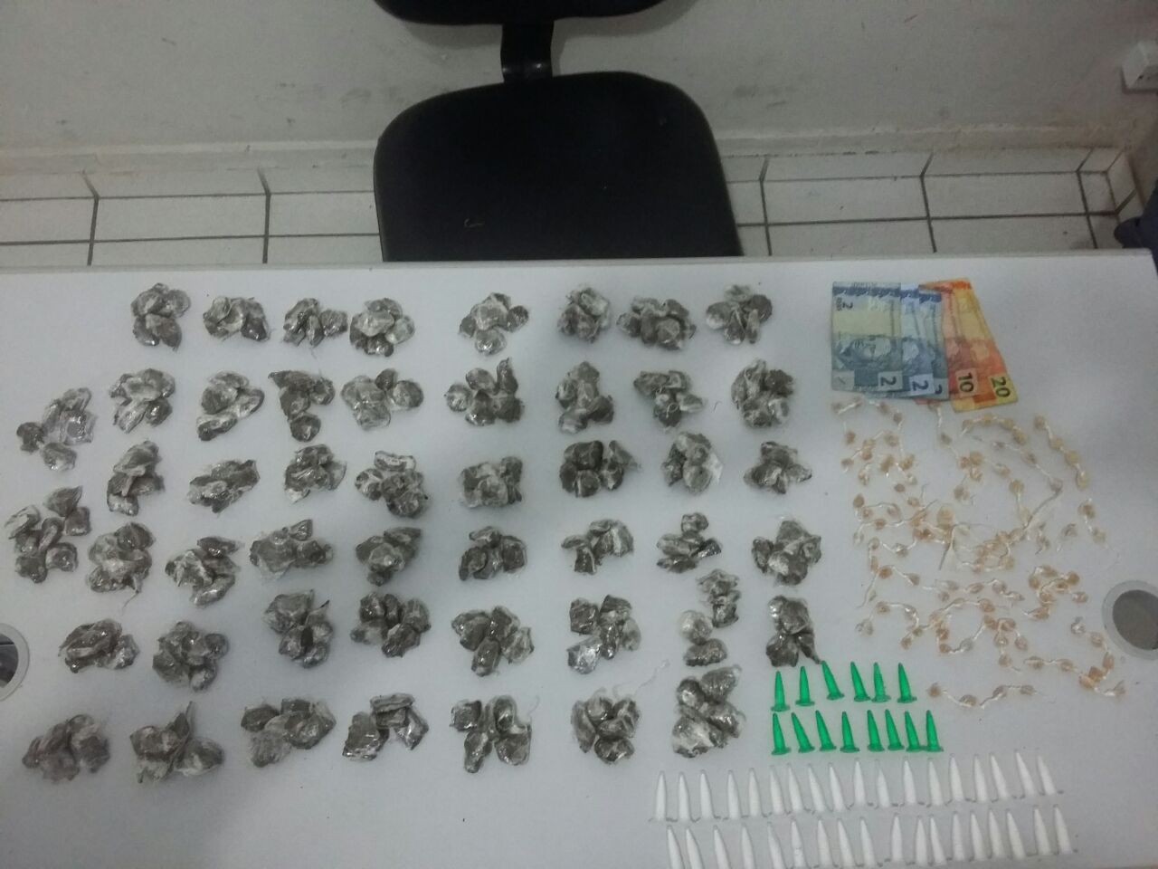 Fábio teria depositado em um matagal uma sacola onde estavam 200 porções de maconha e 70 pedras de crack. Ele ainda jogou um maço de cigarro com mais 36 porções de cocaína e R$ 36 em um telhado.