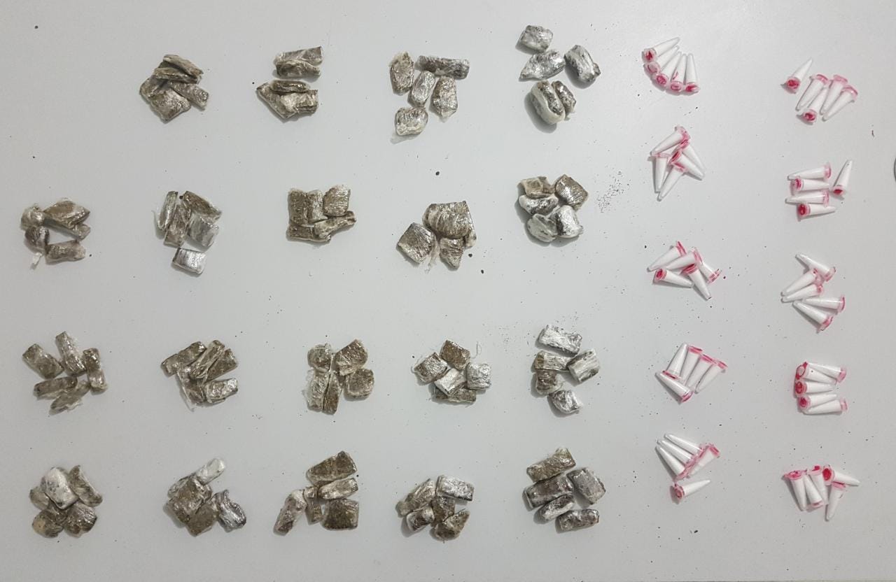 Os policias localizaram 95 porções de maconha (pesando 240 gramas) e 50 pinos com cocaína (pesando 60 gramas) dentro do pote. Ele foi questionado e confessou o tráfico, mas não informou quem seria o proprietário dos entorpecentes.