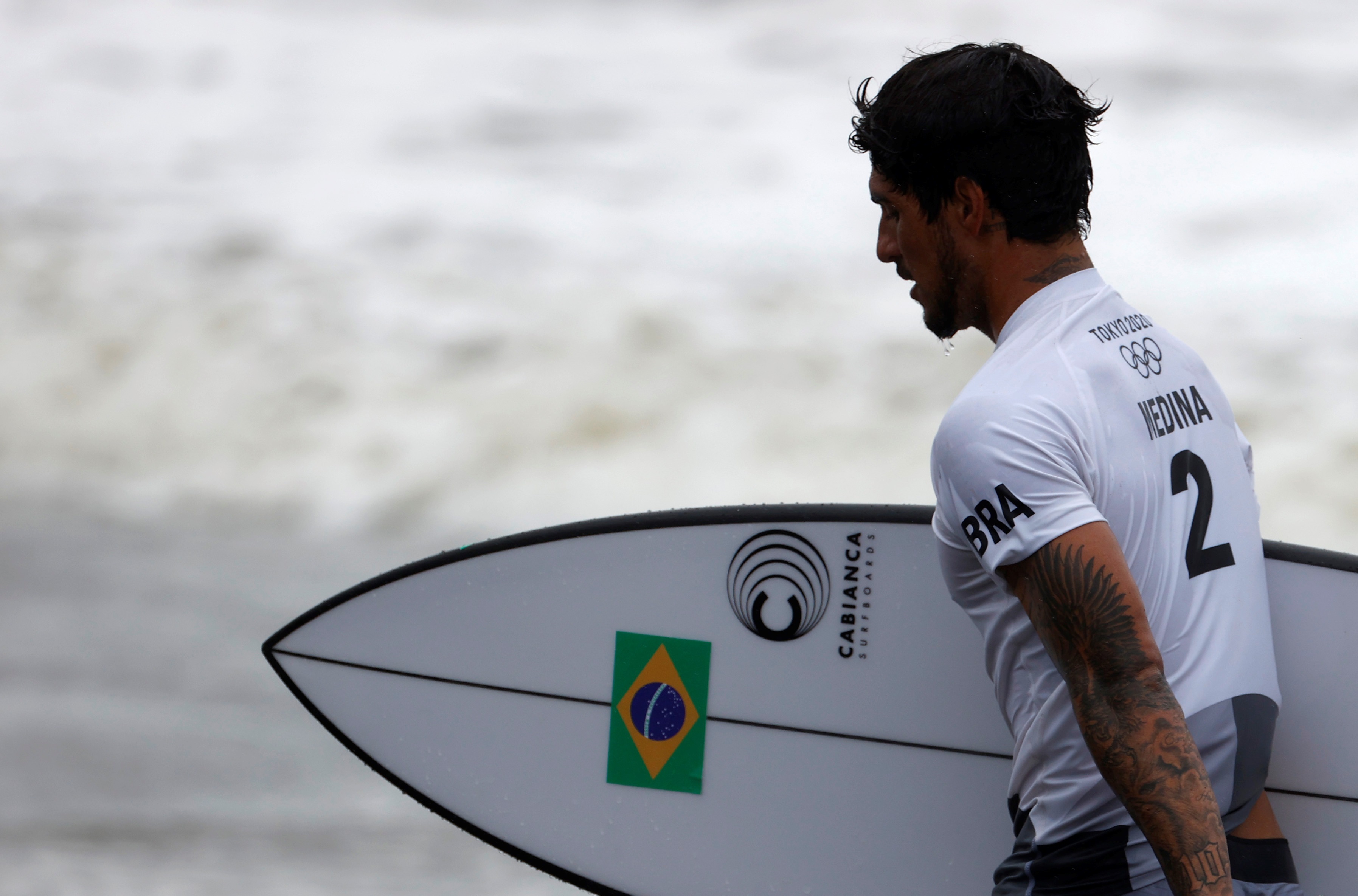 EVE1337. TSURIGASAKI (JAPÓN), 27/07/2021.- Gabriel Medina de Brasil carga su tabla durante los cuartos de final masculinos del surf en los Juegos Olímpicos Tokio 2020, este martes en la playa de Tsurigasaki (Japón). EFE/ Miguel Gutiérrez