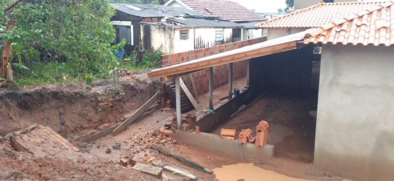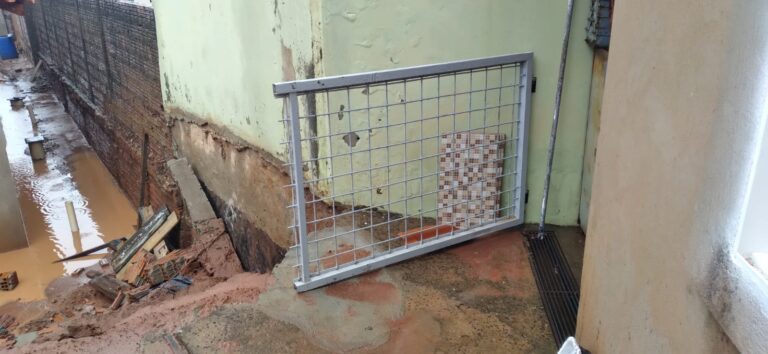 Com o solo encharcado e movimentação da terra em razão das chuvas intensas, o muro cedeu, provocando o desabamento de parte da estrutura da obra e também do muro da residência localizada acima. O incidente atingiu a área próxima à entrada da casa, situada nos fundos do terreno.