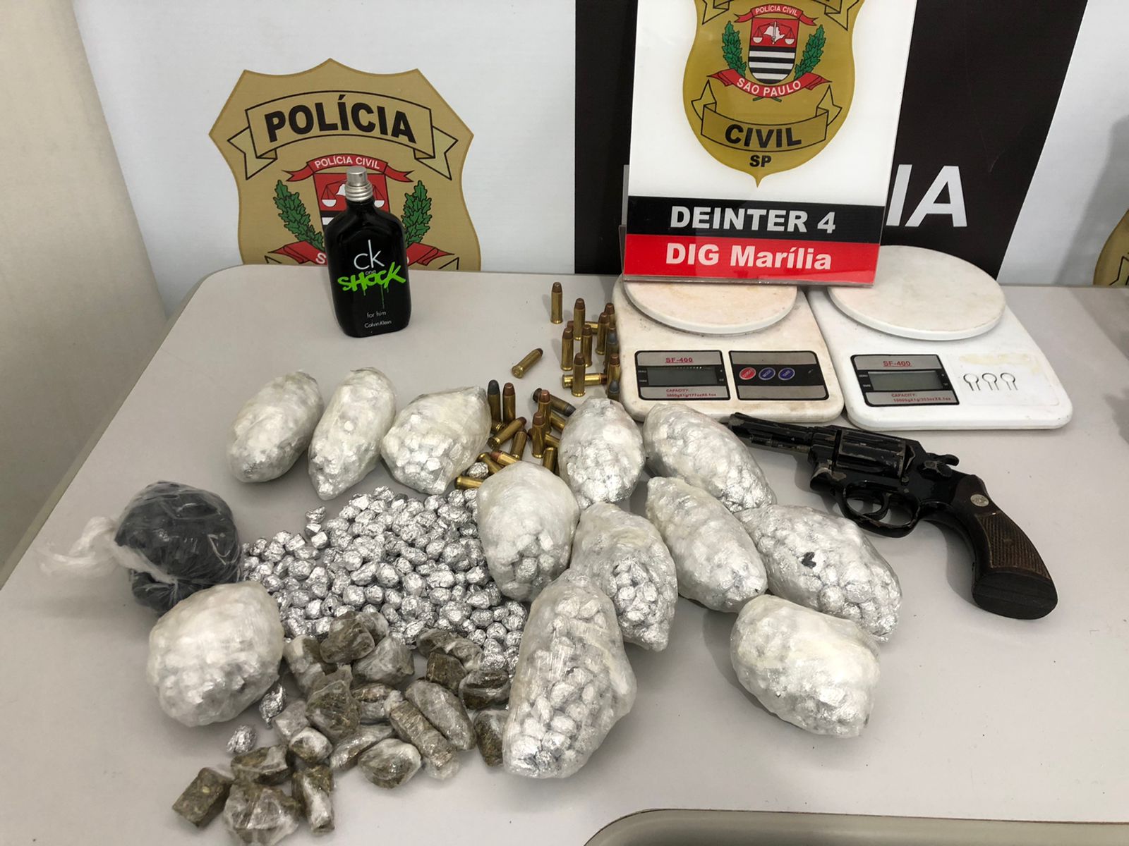 Drogas, arma de fogo e munições apreendidas pela Polícia Civil de Marília (Foto: Divulgação)
