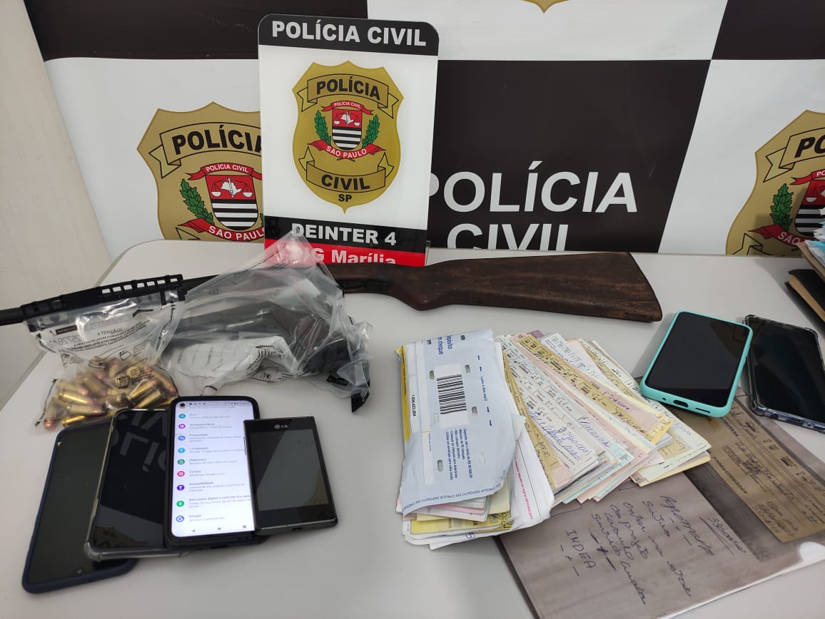 Em dois imóveis, na cidade vizinha, os policiais apreenderam uma pistola calibre 45, um revólver calibre 357, uma espingarda e diversas munições, além de celulares. Também foram apreendidos vários cheques.