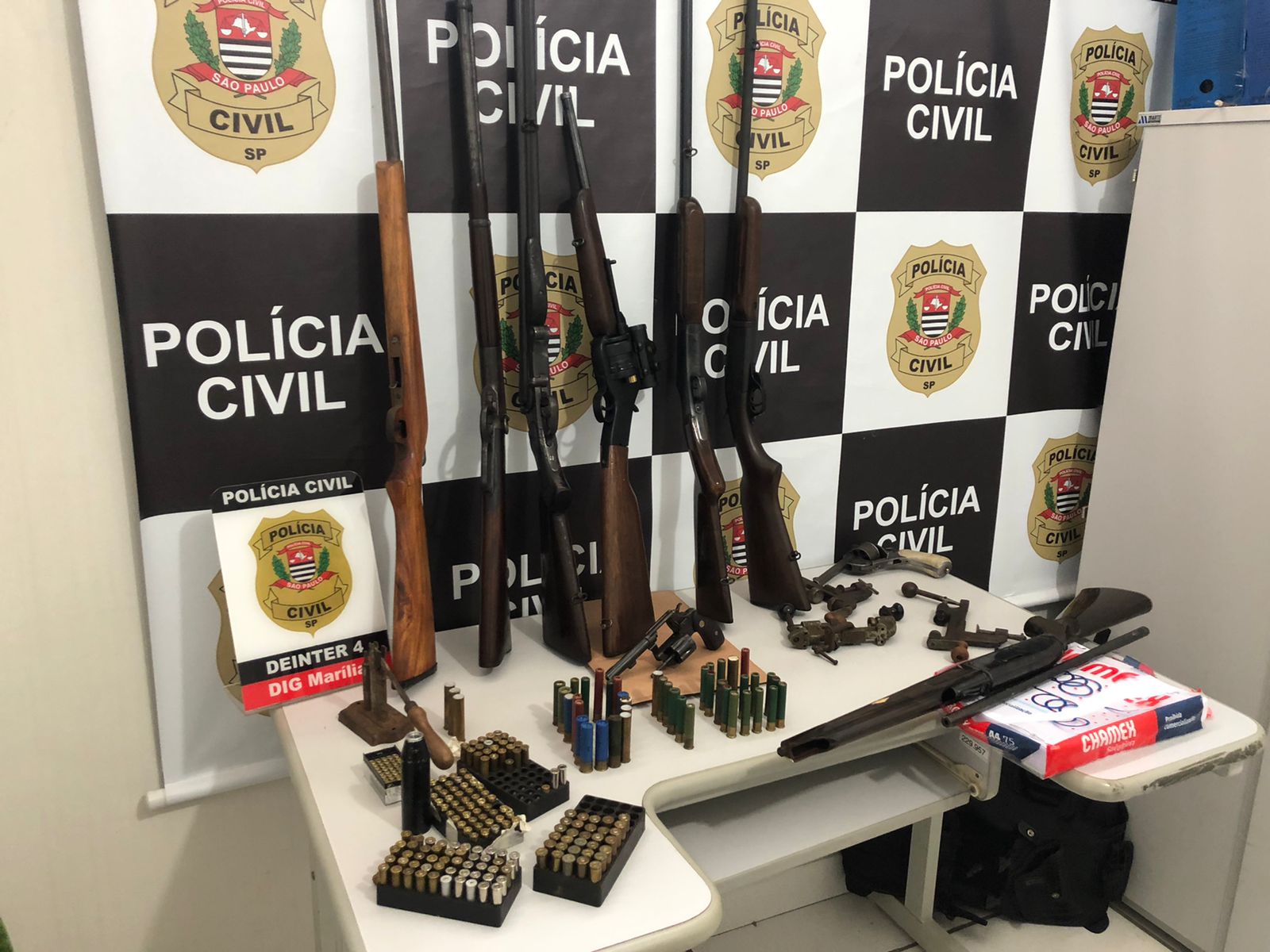 Foram apreendidas duas espingardas calibre 22, uma carabina sem numeração, uma espingarda calibre 28/32, uma espingarda 28, uma espingarda 44, um revólver 32 e outro calibre 28, além de diversas munições.