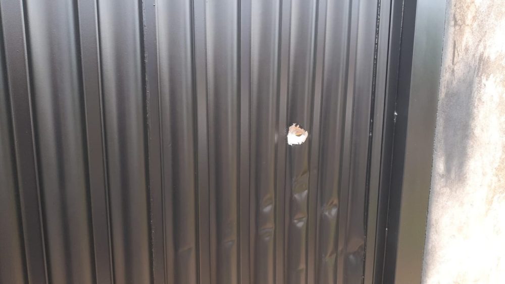 Marca de tiro no portão da casa (Foto: Divulgação/Repórter Sidney)