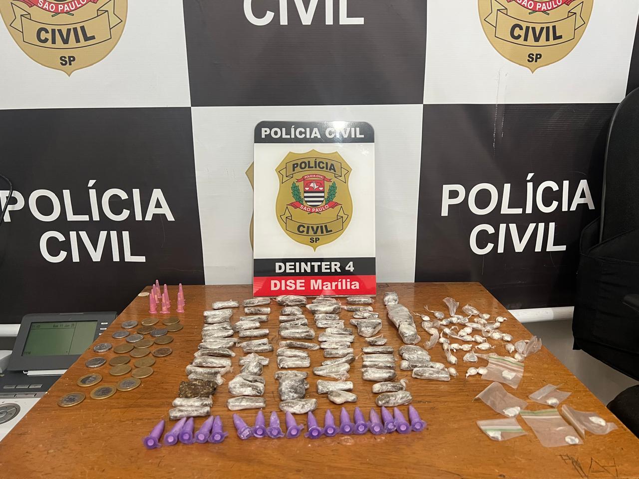 O homem preso foi autuado em flagrante pelos crimes de tráfico de drogas e associação para o crime, e encaminhado à CPJ de Marília, onde deve passar por audiência de custódia.