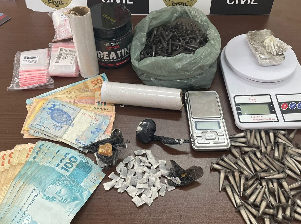 Durante as buscas, os policiais encontraram mais de 80 pinos com cocaína, quase 40 porções de crack, uma porção grande de cocaína a granel, uma pedra bruta de crack ainda não fracionada, R$ 3.445, além de duas balanças de precisão e apetrechos para embalar e preparar a droga. Também foram apreendidos dois celulares.