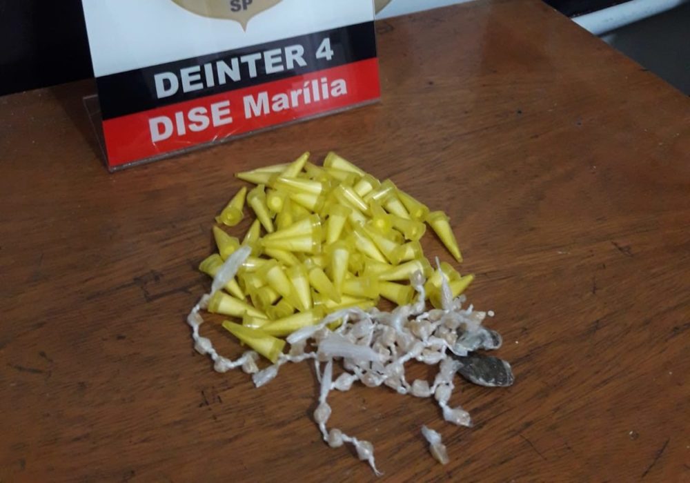 Os agente tentaram detê-lo, mas ele conseguiu fugir. Na fuga, o jovem jogou a marmita e os entorpecentes. Foram dispensados 53 pinos com cocaína, 61 porções de crack e duas porções de maconha.