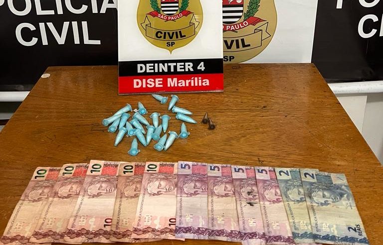 Foi feita a abordagem. Em um matagal próximo, os investigadores encontraram 22 pinos com cocaína, dois pinos com crack e R$ 74.