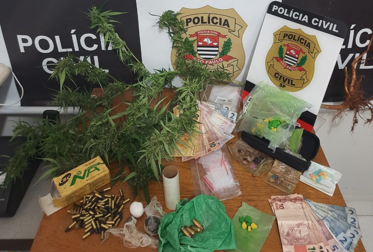 Na residência, a especializada apreendeu um pé de maconha; uma porção da mesma droga, uma de haxixe e uma cocaína; seis comprimidos provavelmente de ecstasy, sendo três de cor verde e três amarelos; cinco munições de arma calibre 380; 68 munições calibre 22; um rolo pequeno de plástico filme; e vários saquinhos comumente utilizados para embalar drogas.