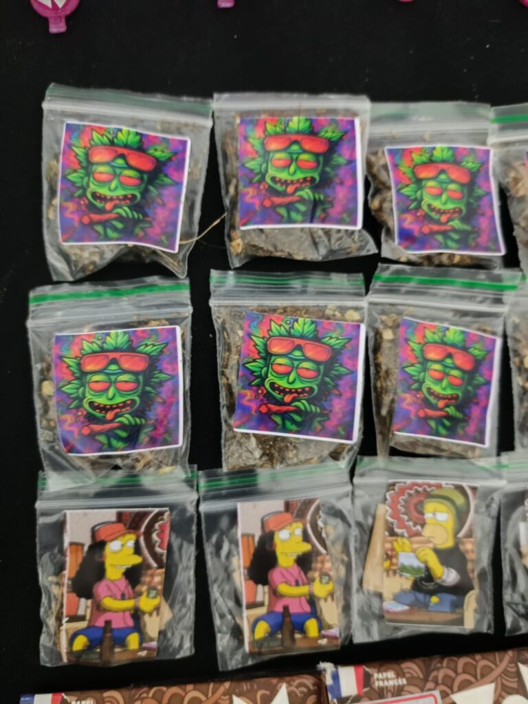 Entre os itens apreendidos estavam 228 microtubos com características de crack, diversas porções de cocaína identificadas com adesivos — incluindo a inscrição “Capão 40$” e figuras como “Seu Madruga” — além de porções de haxixe, maconha do tipo “Gold”, “flor de maconha” e kits com papel de seda.