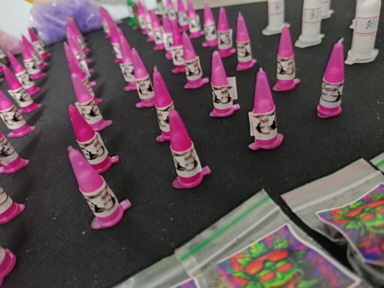 Também foram apreendidos microtubos e pinos vazios, além de embalagens do tipo “zip lock”, indicando preparo para distribuição.