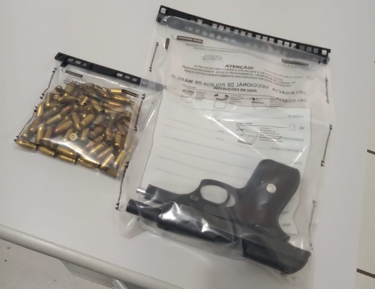 Um homem de 30 anos, que não teve a identidade divulgada, foi localizado com uma porção de entorpecente e uma arma de fogo, calibre 380 ACP, com a numeração “pinada”, com carregador vazio, além de 85 munições intactas, calibre 380.