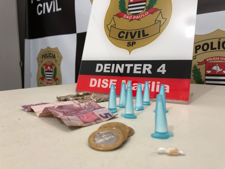 Ele foi flagrado por uma equipe da Delegacia de Investigações Sobre Entorpecentes (Dise) com oito pinos com cocaína e seis porções de maconha, além de certa quantia em dinheiro.
