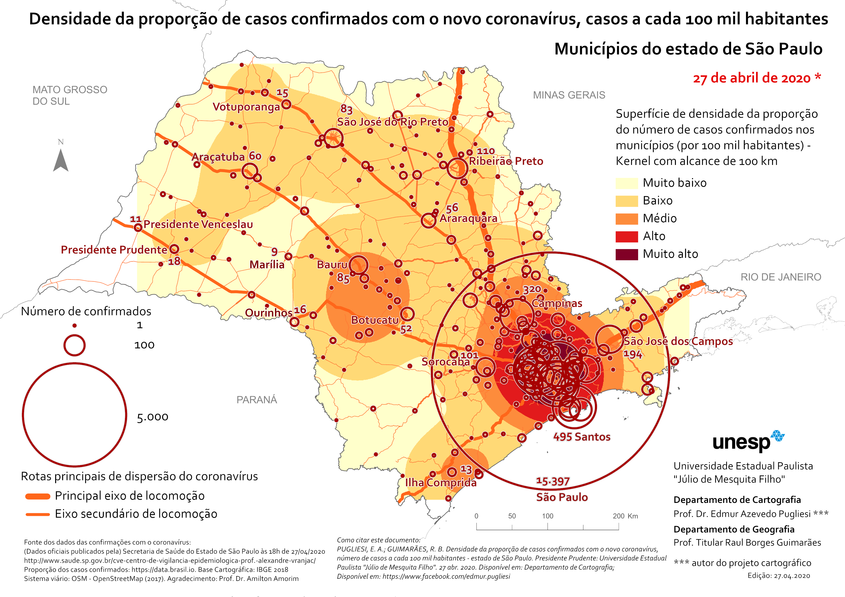 No momento, o maior número de casos confirmados do novo coronavírus segue um eixo diagonal que passa por Santos, São Paulo, Campinas, Piracicaba, Araraquara, Ribeirão Preto e São José do Rio Preto.