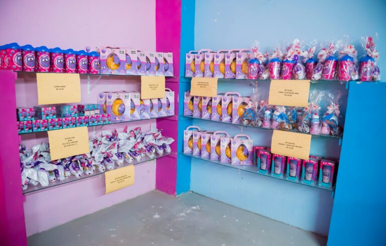 O ambiente da loja foi preparado para oferecer uma experiência visual atrativa às famílias, com espaços decorados e “pontos instagramáveis”, incluindo cenários temáticos como a corujinha Bubu e dinossauros iluminados.