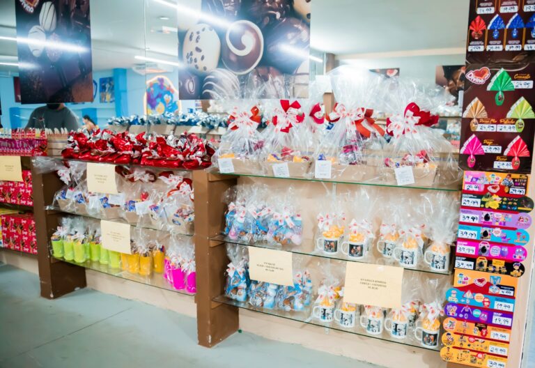 A loja oferece ampla variedade de ovos de Páscoa, com opções que vão de linhas infantis a sabores tradicionais e mais sofisticados. Com preços competitivos, o estabelecimento aposta na diversidade para atrair clientes na temporada.
